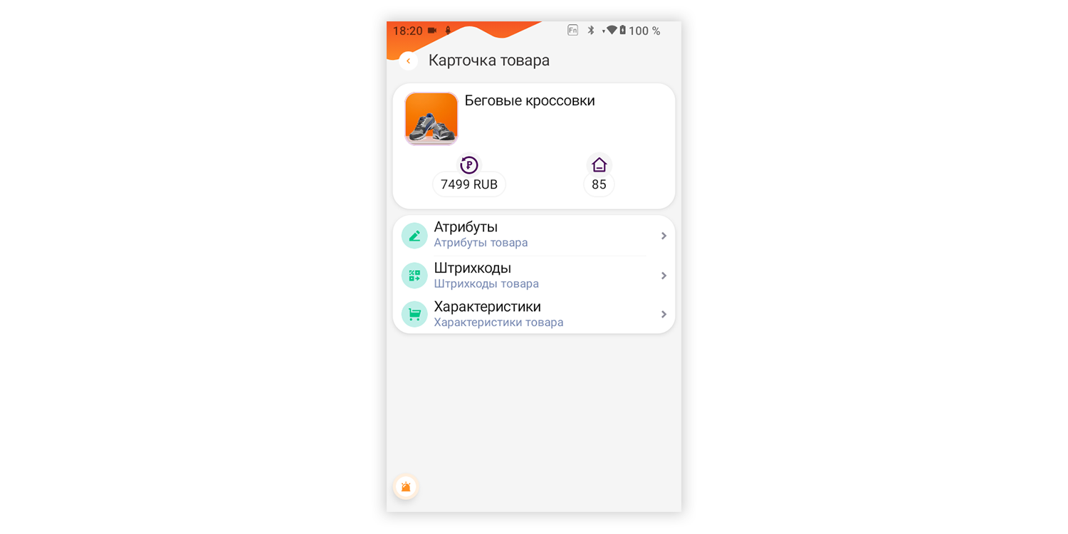 Карточка содержит: название, цену, остаток на складе, изображение. Также можно задать атрибуты, например, серийный номер или вес тары. Софт позволяет дополнять описание номенклатуры в карточках изображениями. Для этого пользователь нажимает кнопку «Камера» и делает снимок изделия. Фото сохраняется и загружается в «1С».