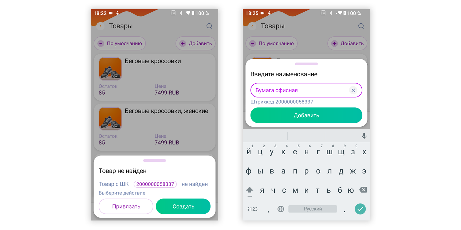 - Отсканировать штрих-код с товара: если идентификатор не найден, программа предложит создать позицию.
