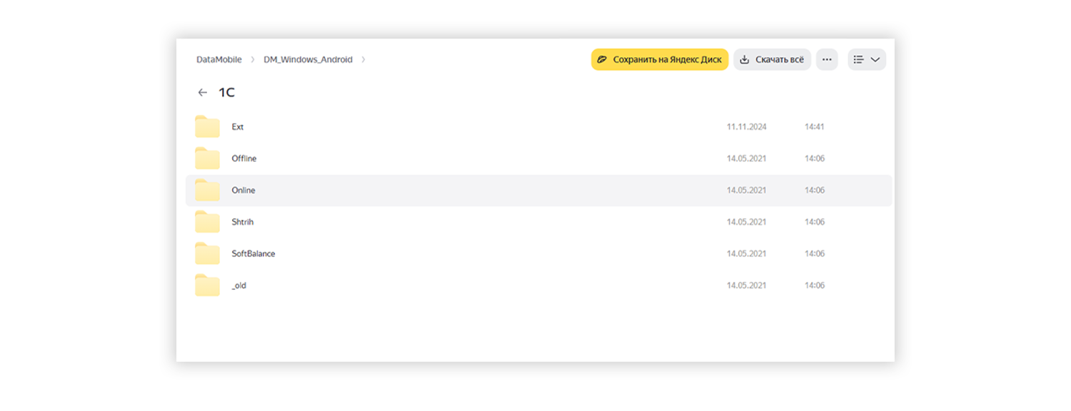 - Скачайте обработку или онлайн модули с Я.Диска с сайта data-mobile.ru/donwload, найдите папку, DM_Windows_Android/1C/[Online|Offline], произведите установку в «1С». Установите в конфигураторе «1С» наш модуль.