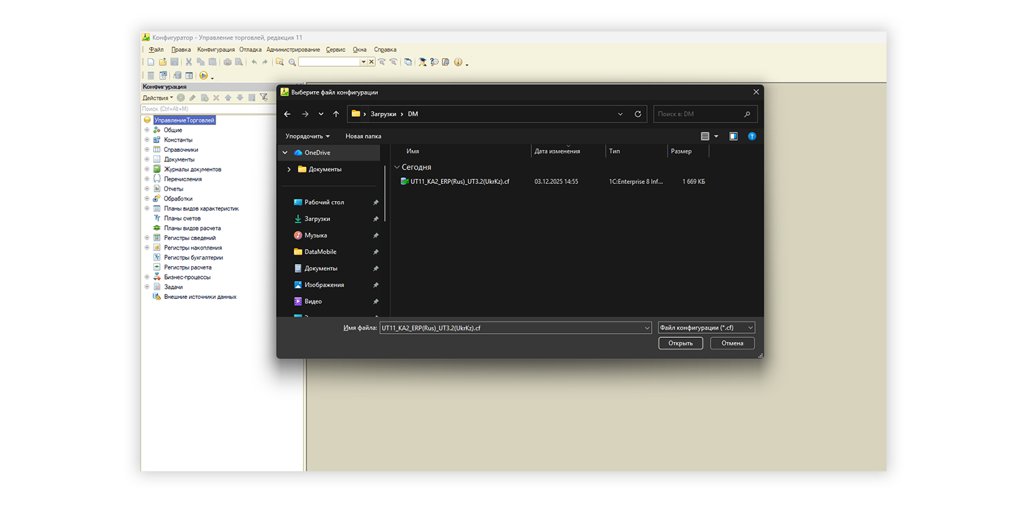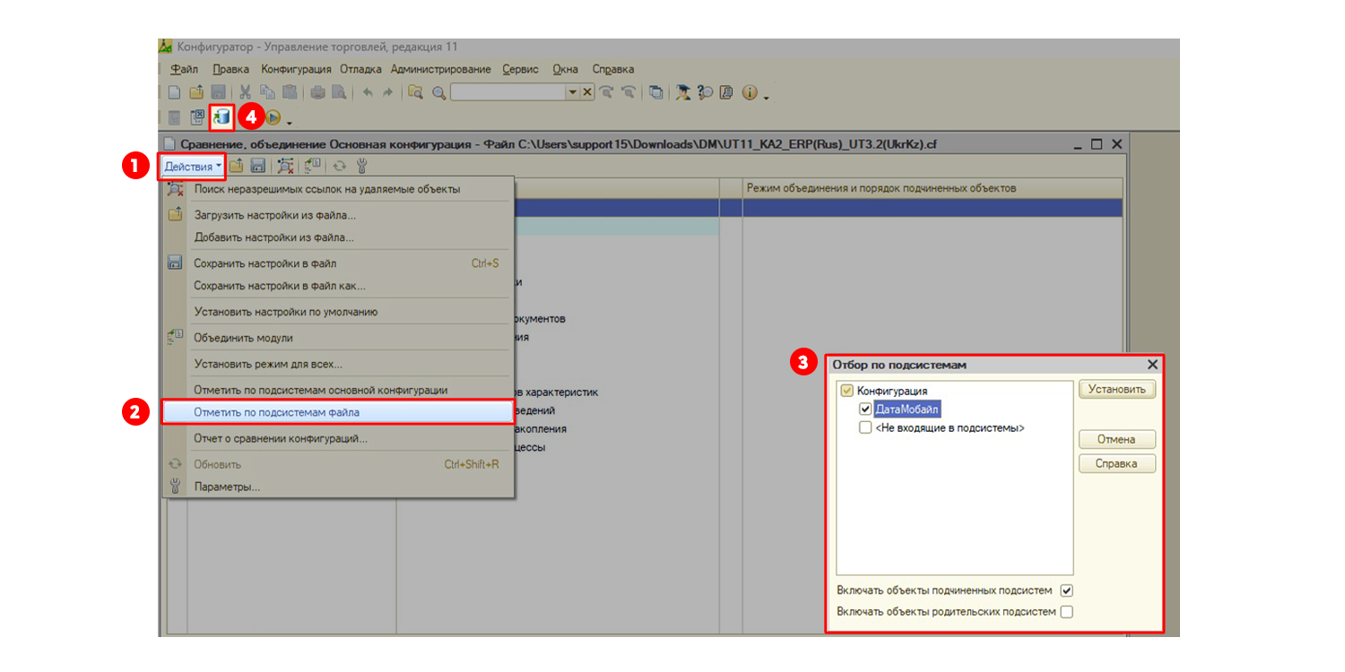 - После загрузки нажмите «Действия» → «Отметить по подсистемам файла» → установите флажки только на подсистемах, начинающихся с «DataMobile» или «ДатаМобайл» → «Установить». Затем нажмите «Объединить» и сохраните конфигурацию. Без этого модули не интегрируются полностью.