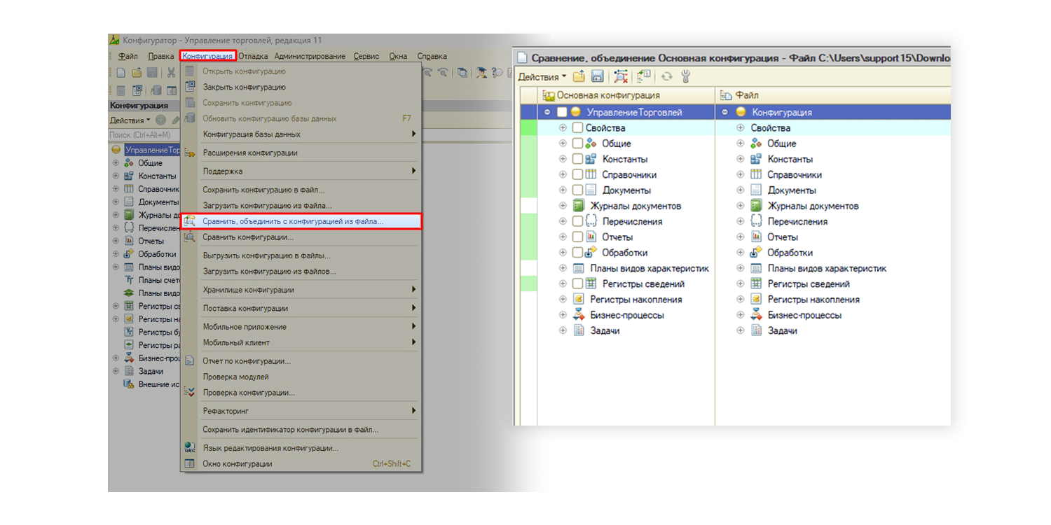 - В «товароучетке» пройдите во вкладку «Конфигурация» → «Сравнить, объединить…». Кликните на файл, который скачали. В появившемся окне снимите флажки со всех модулей «