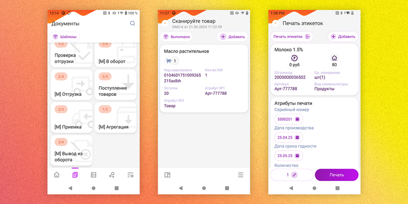 У DataMobile простой интерфейс, ПО интегрируется с «1С». Софт инсталлируется на ТСД и другие мобильные устройства на Android. Для товаров, подлежащих прослеживанию через систему «Честный ЗНАК», с ПО DataMobile задействуют программный модуль Маркировка. Он помогает автоматизировать учет продукции с DataMatrix. Готовое решение для маркировки, в частности, «умеет»: