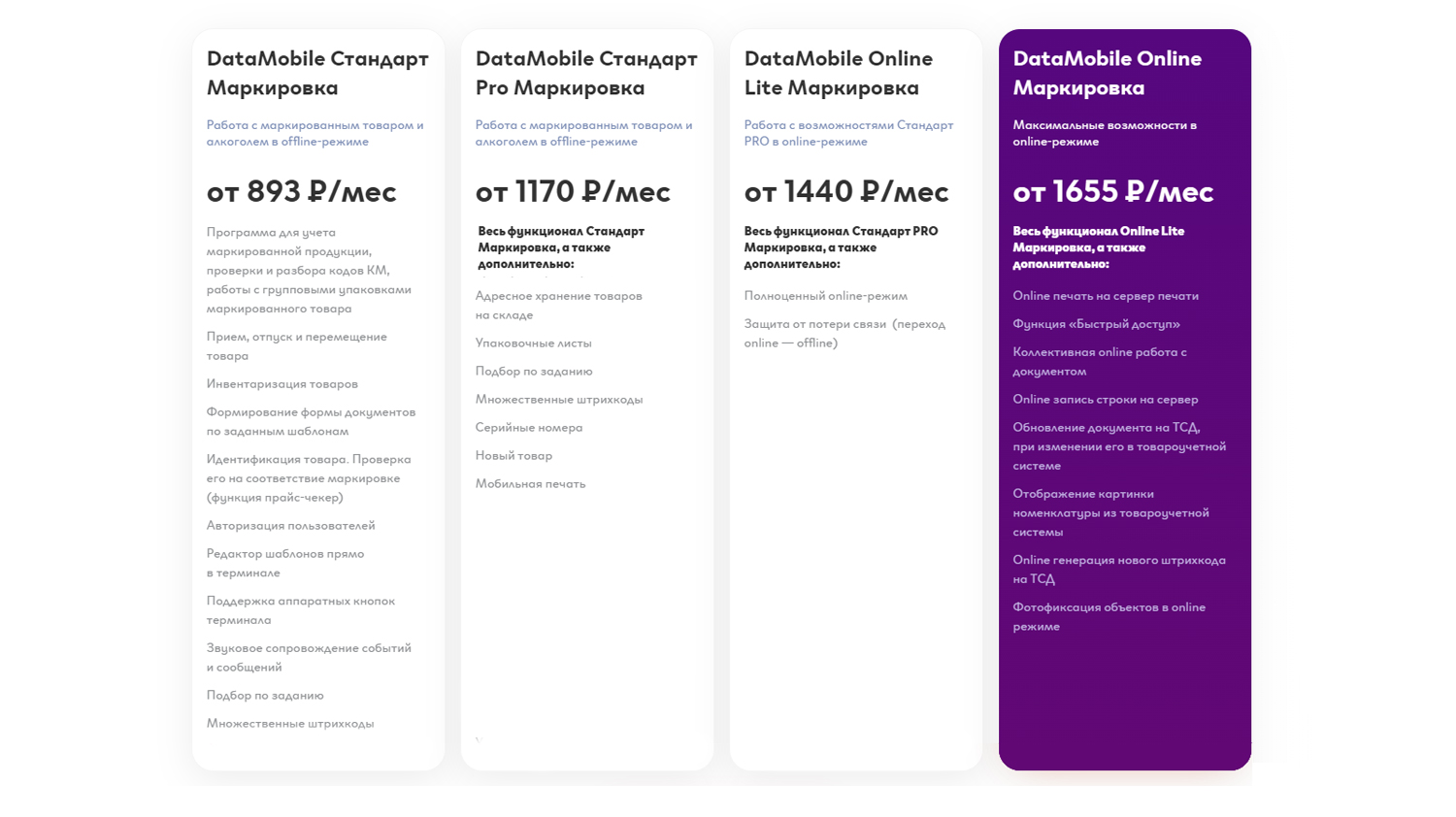Для работы с товарами, подлежащими маркировке средствами идентификации, можно использовать «собранный» нами комплект: терминал с установленным на него ПО. Готовое решение обойдется дешевле, чем покупка каждого из компонентов отдельно. Предлагаем сравнить комплекты мобильных компьютеров с ПО DataMobile.